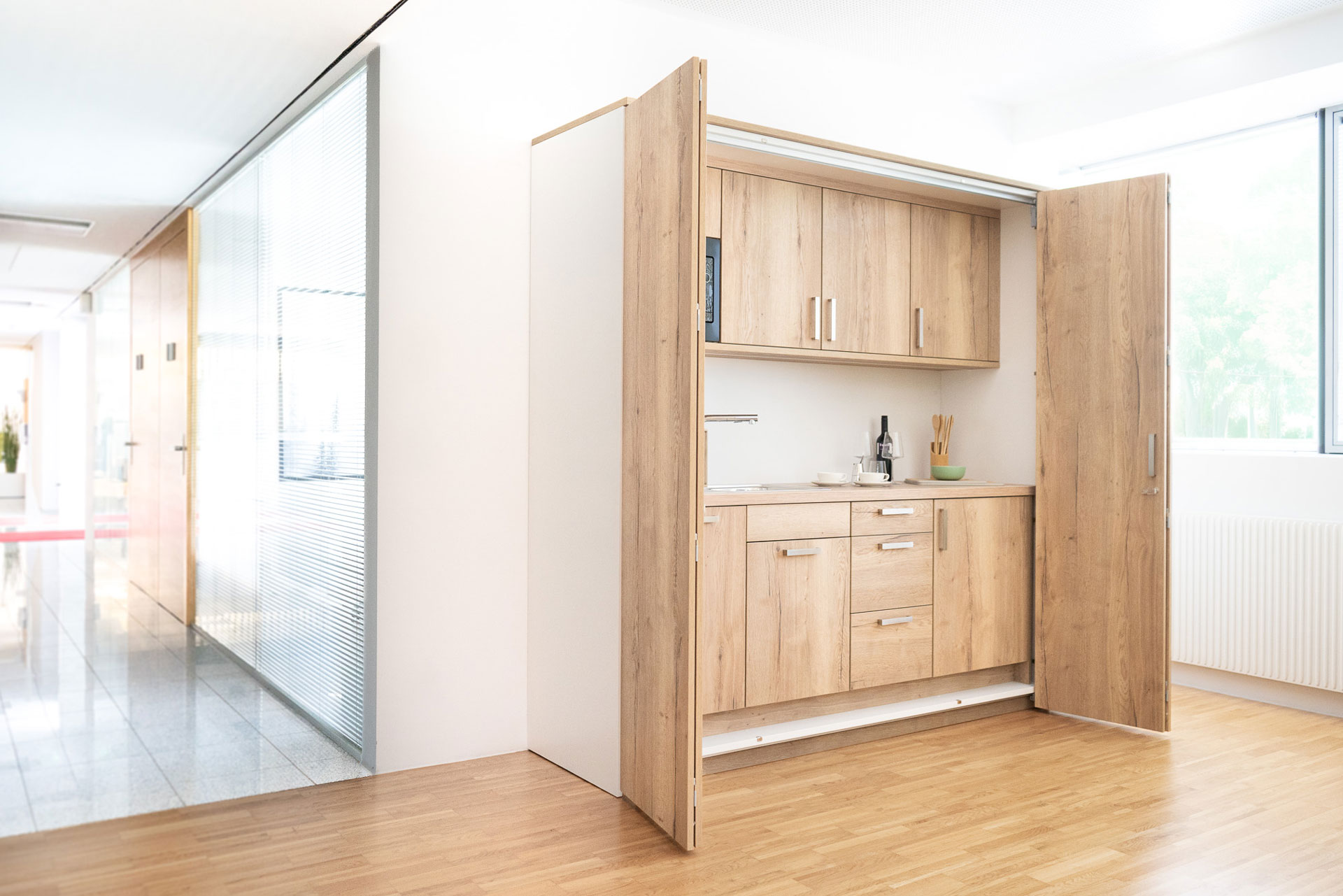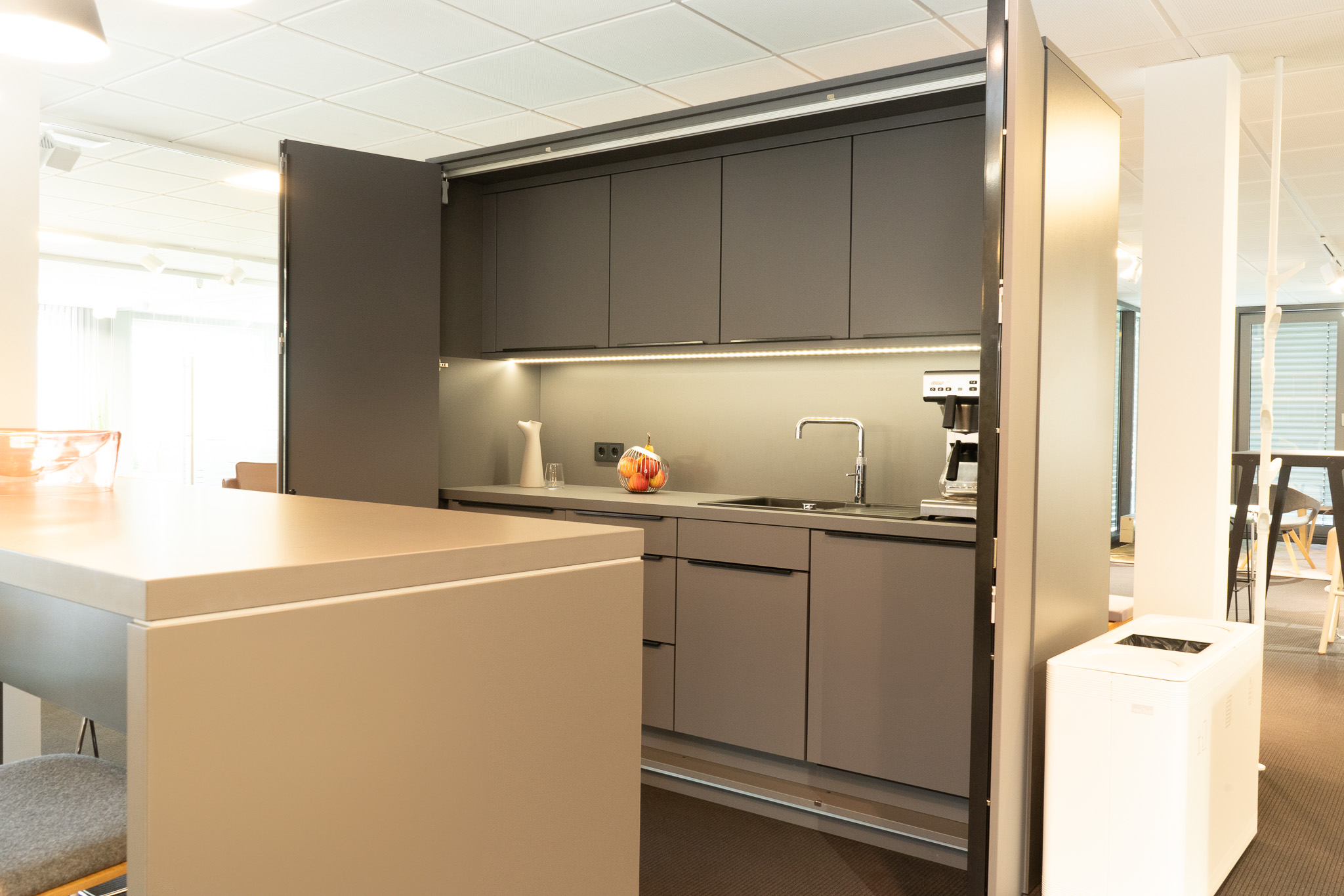 Wir gestalten Küchenlösungen, die sich nahtlos in jede Raumsituation einfügen. Ob großzügige Großraum-Büroküchen, smarte Küchenmodule oder platzsparende Faltküchen, die sich elegant als Schrank ins Raumkonzept .