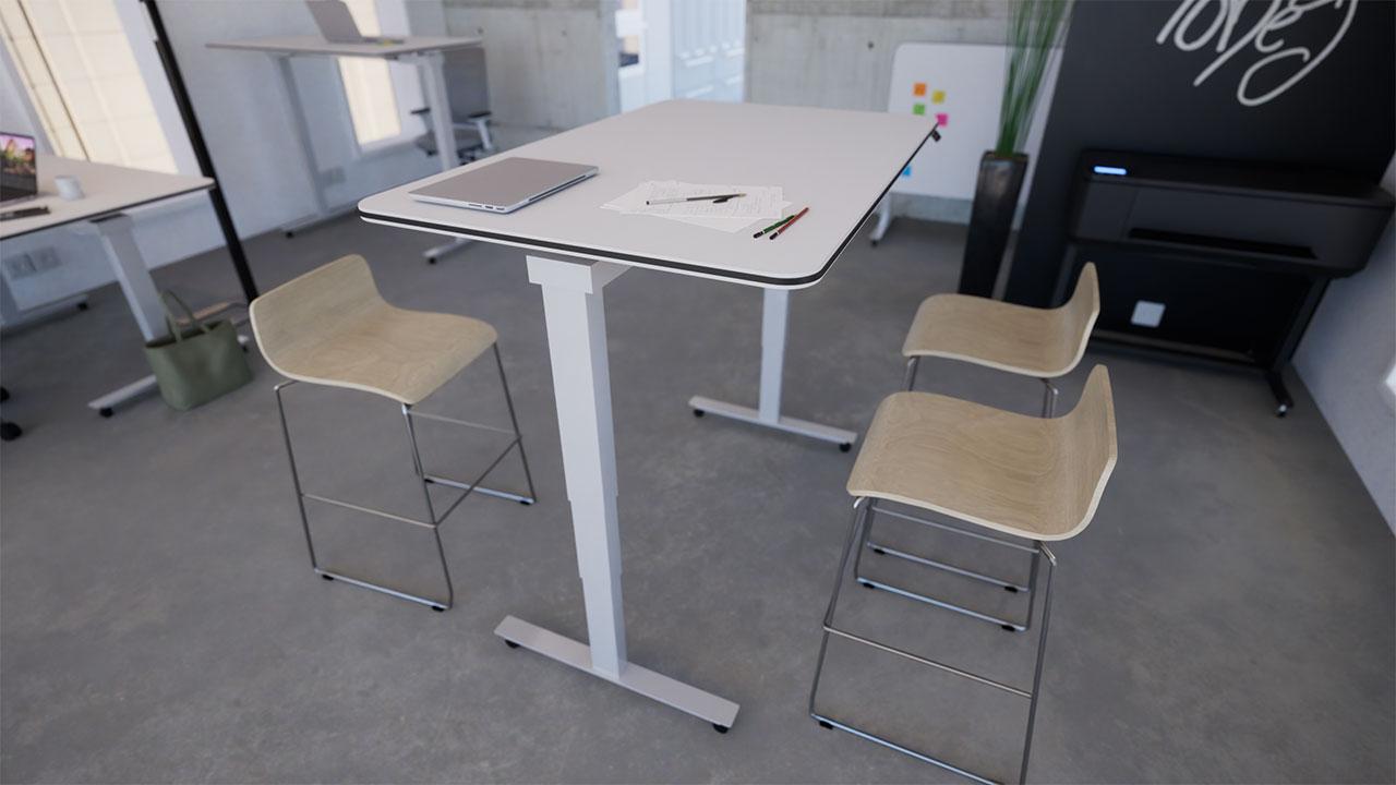 Mal hoch, mal tief und dabei flexibel auf leicht laufenden Rollen passt er sich individuell den geforderten Einsatzbereichen an. Die elektromotorische Höhenverstellung ermöglicht ein ergonomisches Arbeiten mit verschiedenen Sitz-Stehpositionen. 30 Dekore und 3 verschiedene Gestellfarben stehen zur Auswahl, sodass sich der Topspin optisch perfekt in bereits bestehende Arbeitswelten einfügen kann. Mit dem leicht bedienbaren Klappmechanismus kann er sich ganz schlank machen und platzsparend ineinander geschoben werden.