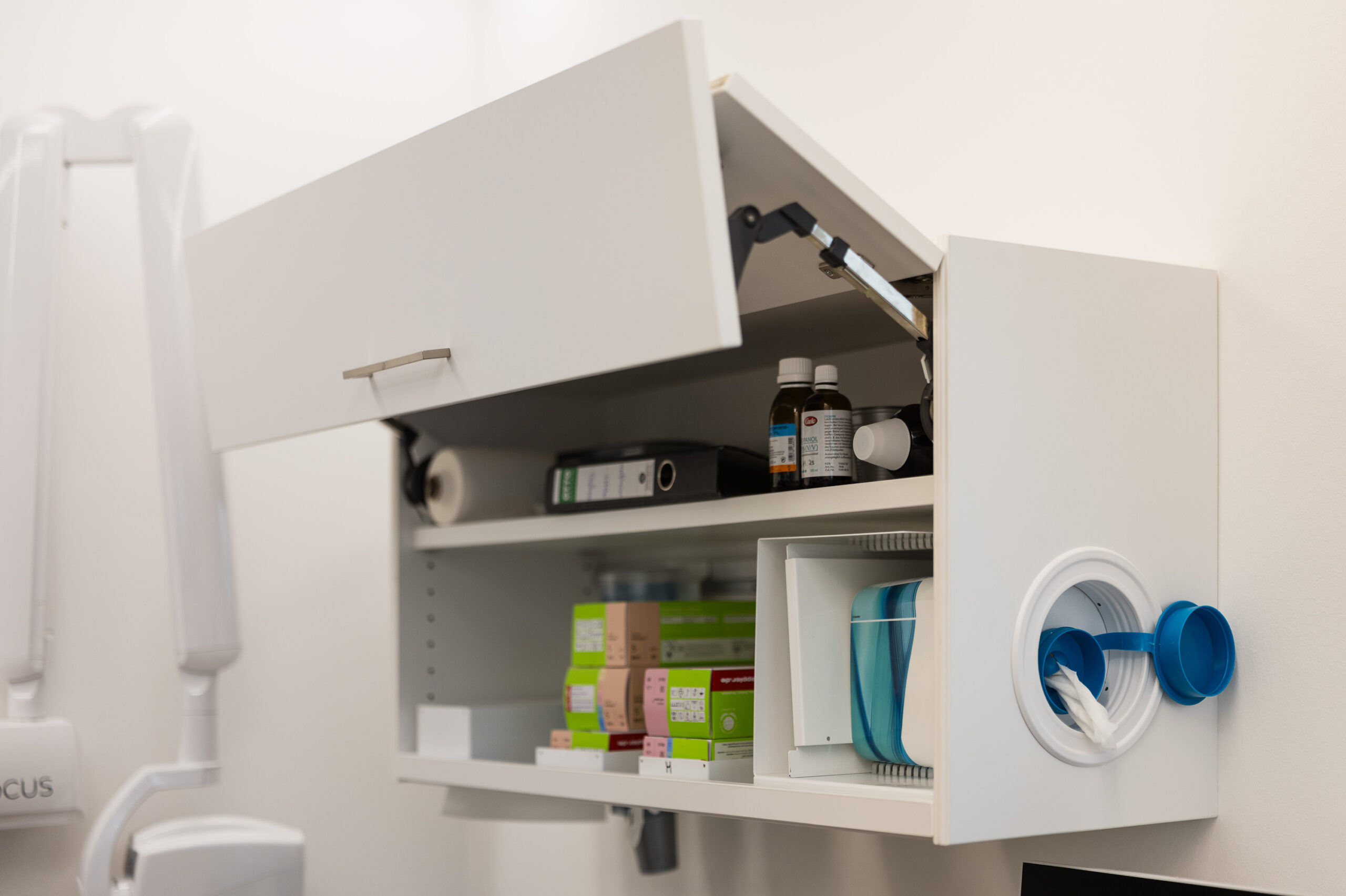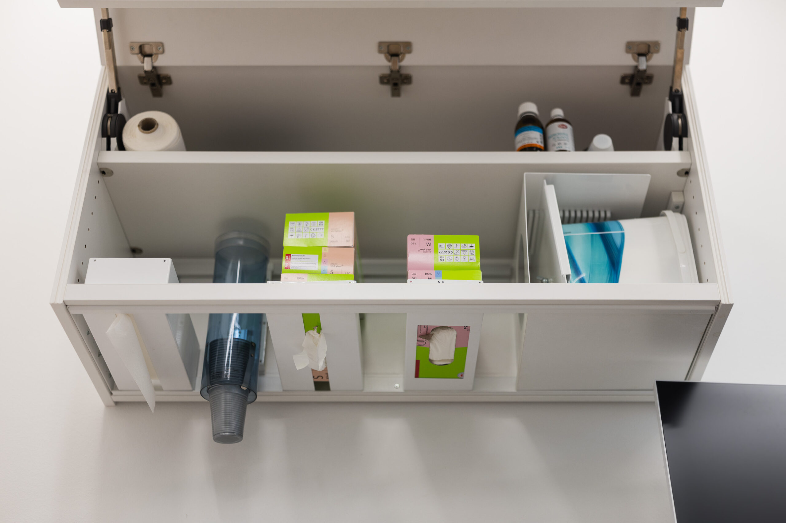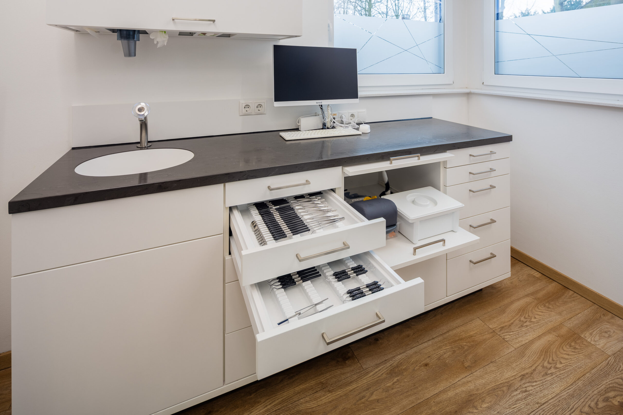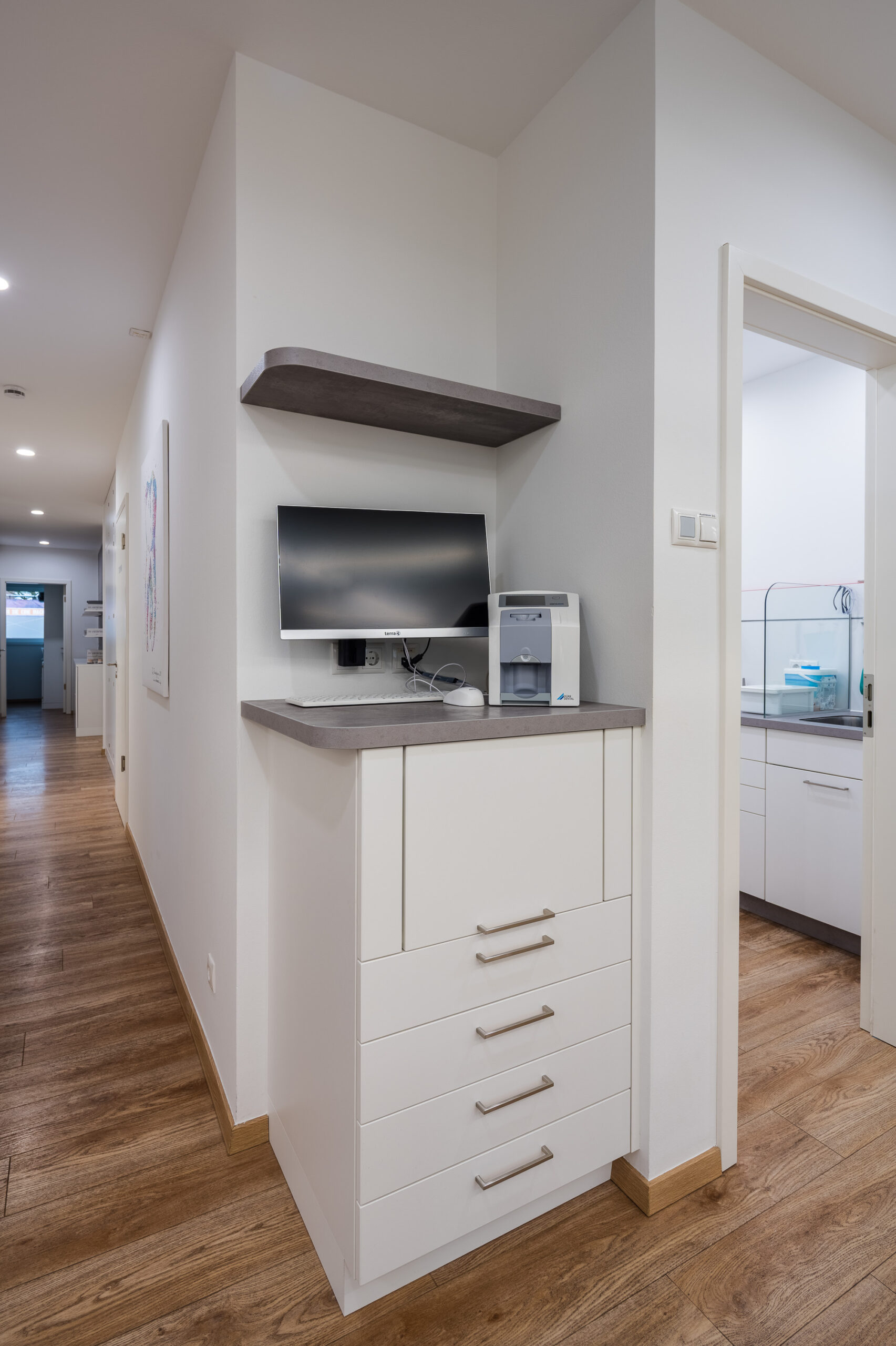 Durchdachte Details wie ein fugenloses Waschbecken, integrierte Spender für Hygienetücher sowie sensorgesteuerte, kontaktlose Öffnungssysteme bei Aufziehschränken unterstützen effiziente und hygienische Abläufe. Eine versteckte Nische für technische Geräte wie Drucker sorgt für ein aufgeräumtes Erscheinungsbild, während speziell angepasste Schränke ausreichend Platz für medizinische Geräte bieten und diese optimal integrieren. Ein ganz besonderes Highlight ist für das Praxisteam die maßgefertigte Empfangstheke aus der Manufaktur.