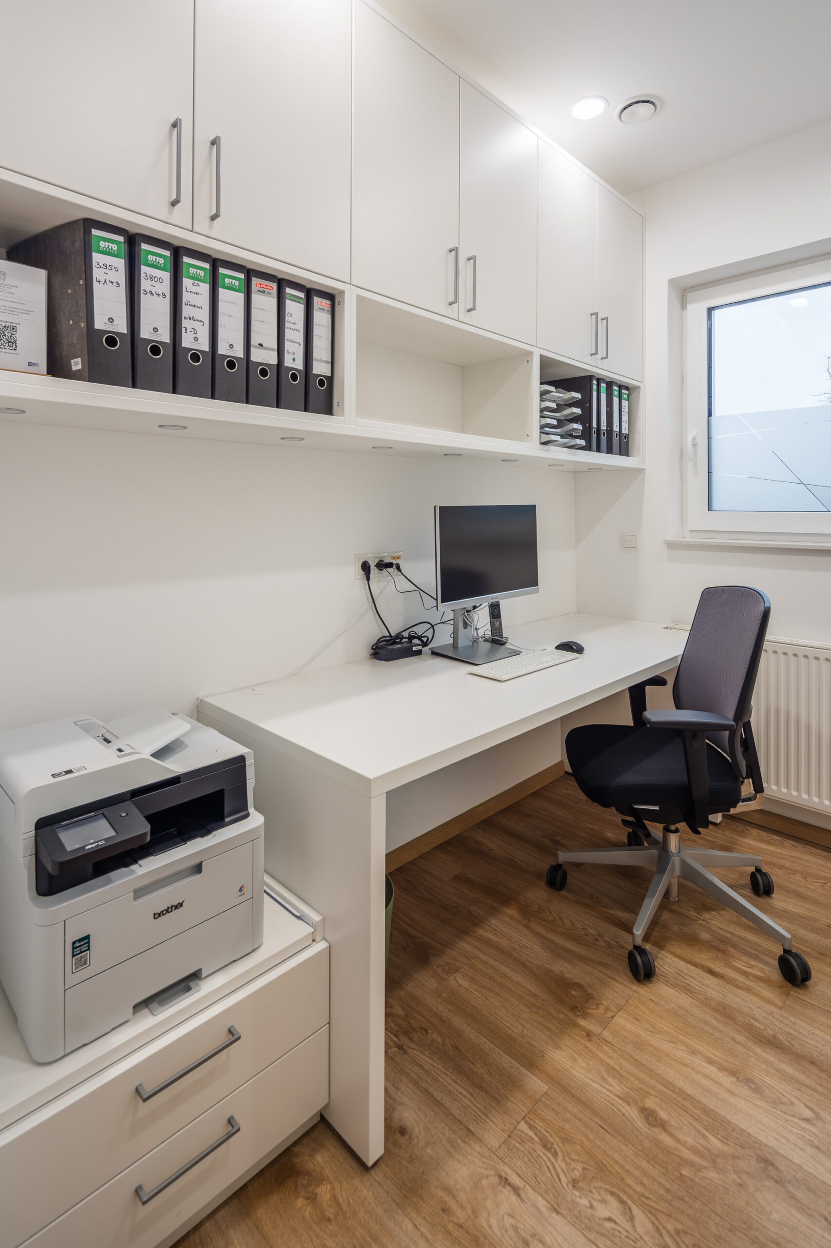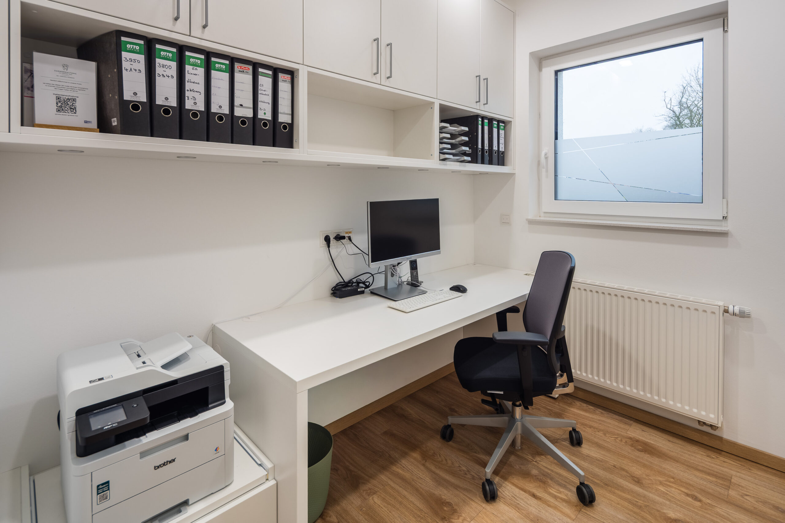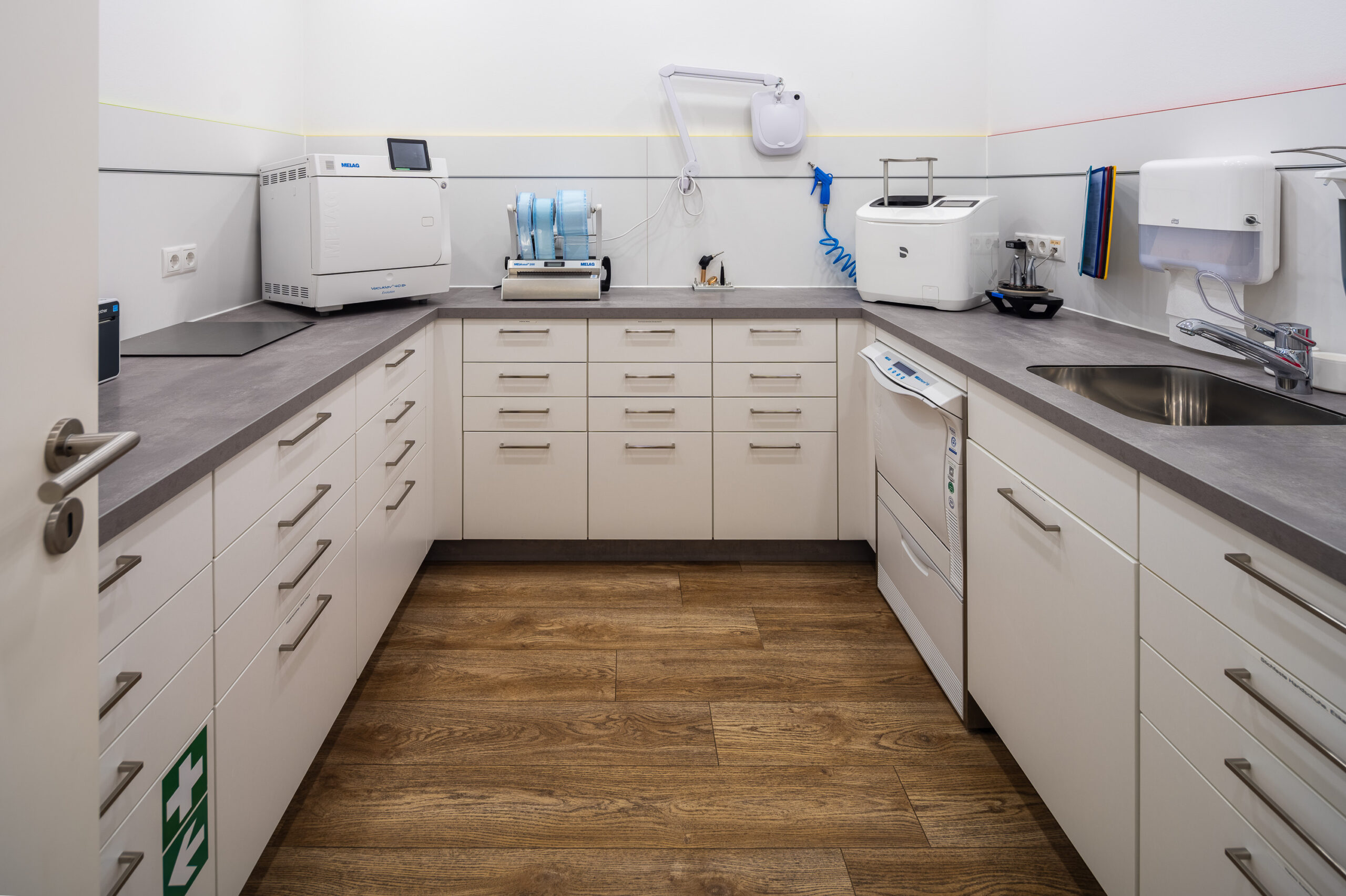 Durchdachte Details wie ein fugenloses Waschbecken, integrierte Spender für Hygienetücher sowie sensorgesteuerte, kontaktlose Öffnungssysteme bei Aufziehschränken unterstützen effiziente und hygienische Abläufe. Eine versteckte Nische für technische Geräte wie Drucker sorgt für ein aufgeräumtes Erscheinungsbild, während speziell angepasste Schränke ausreichend Platz für medizinische Geräte bieten und diese optimal integrieren. Ein ganz besonderes Highlight ist für das Praxisteam die maßgefertigte Empfangstheke aus der Manufaktur.