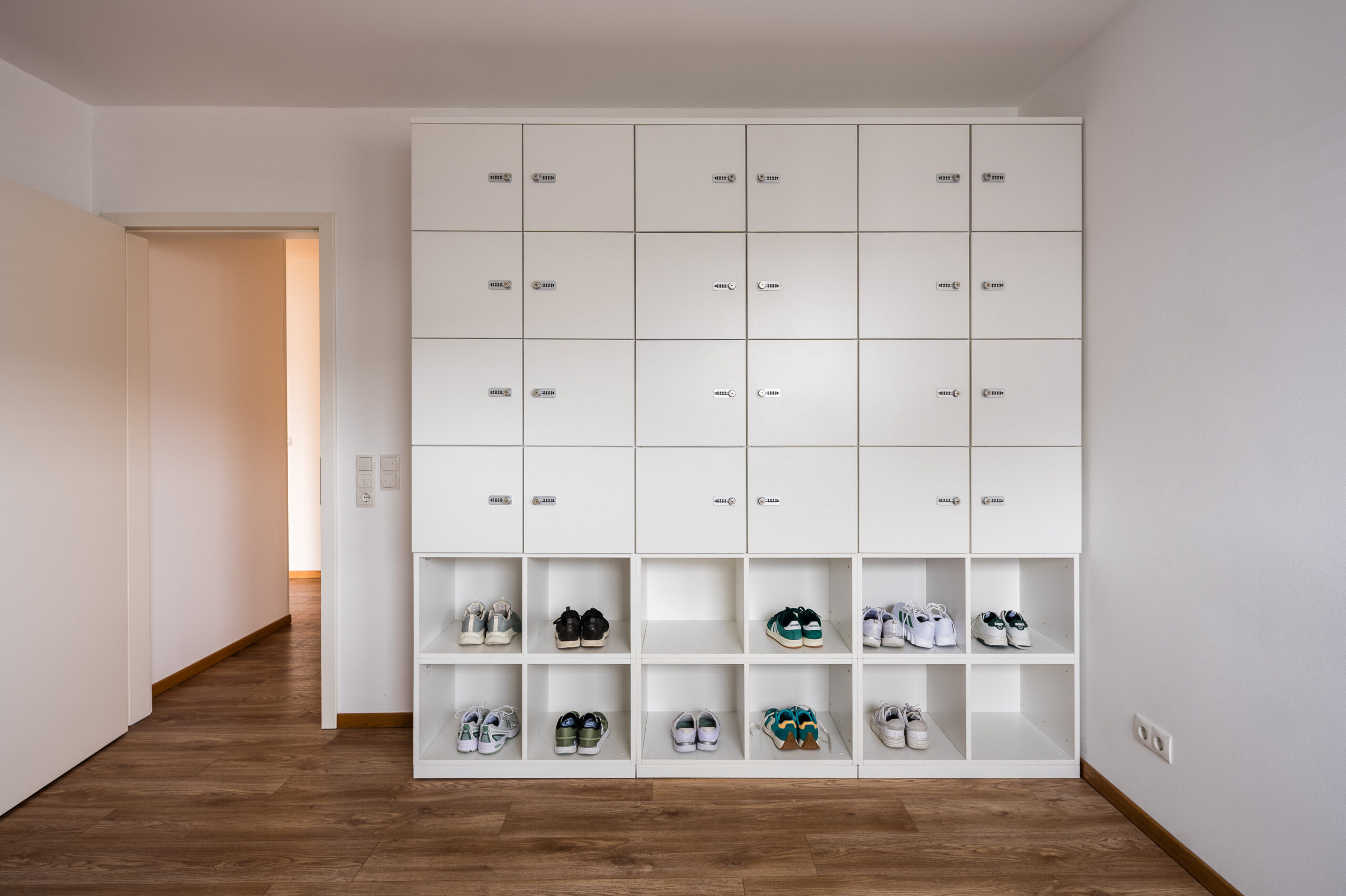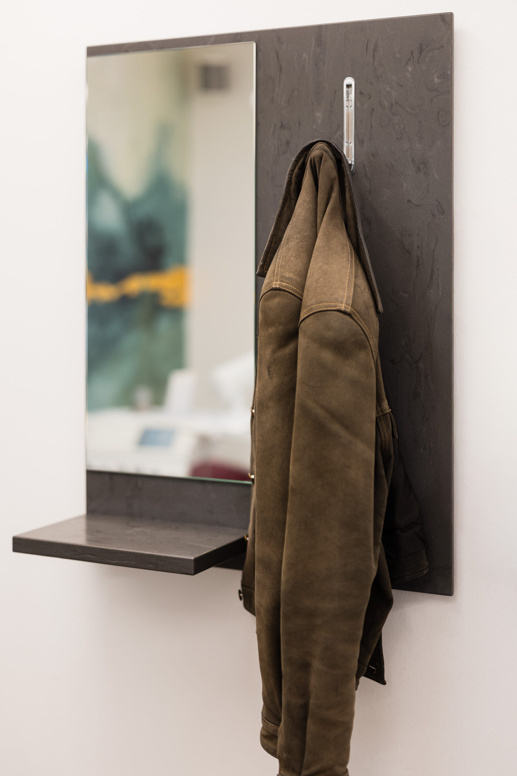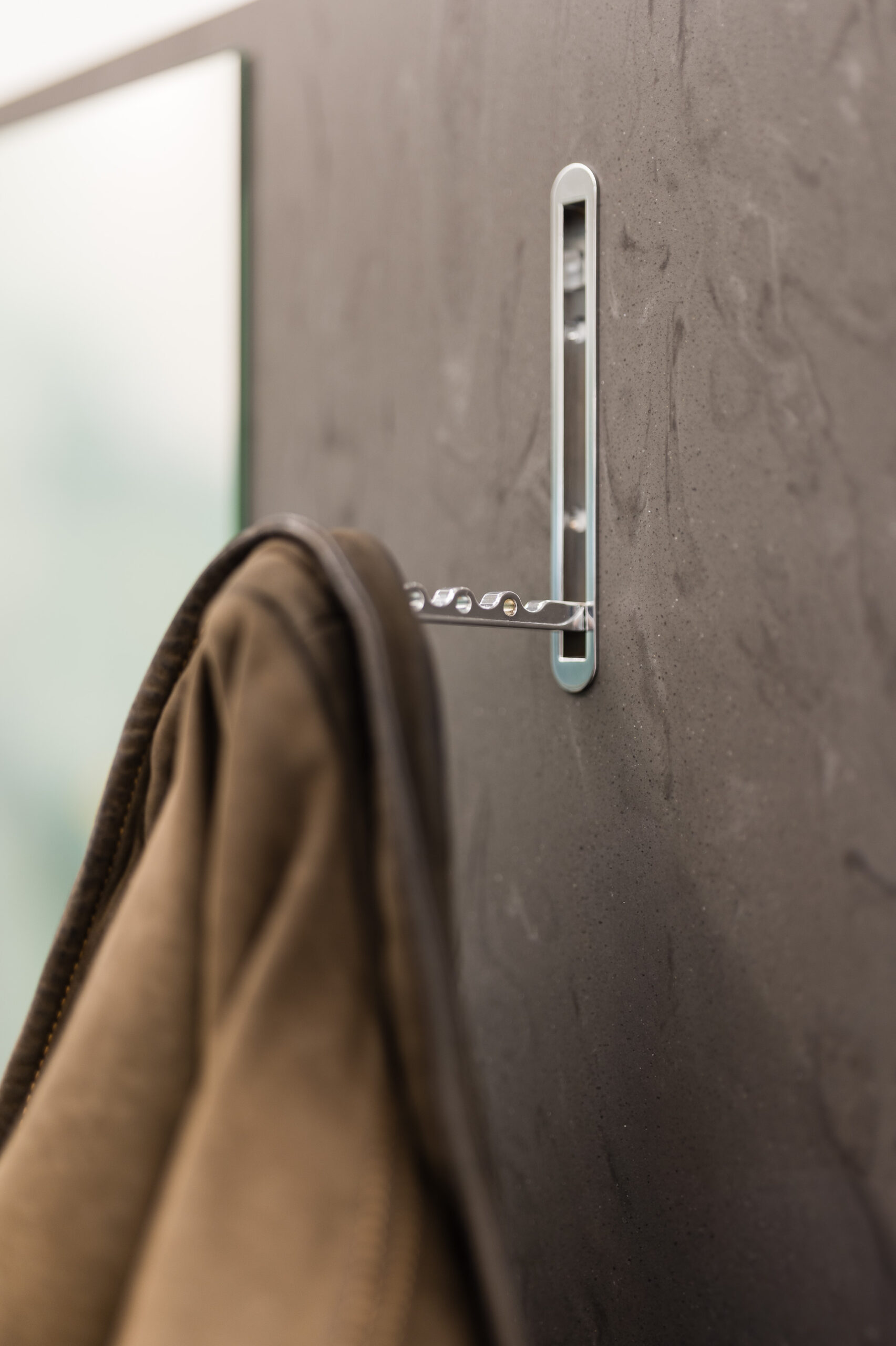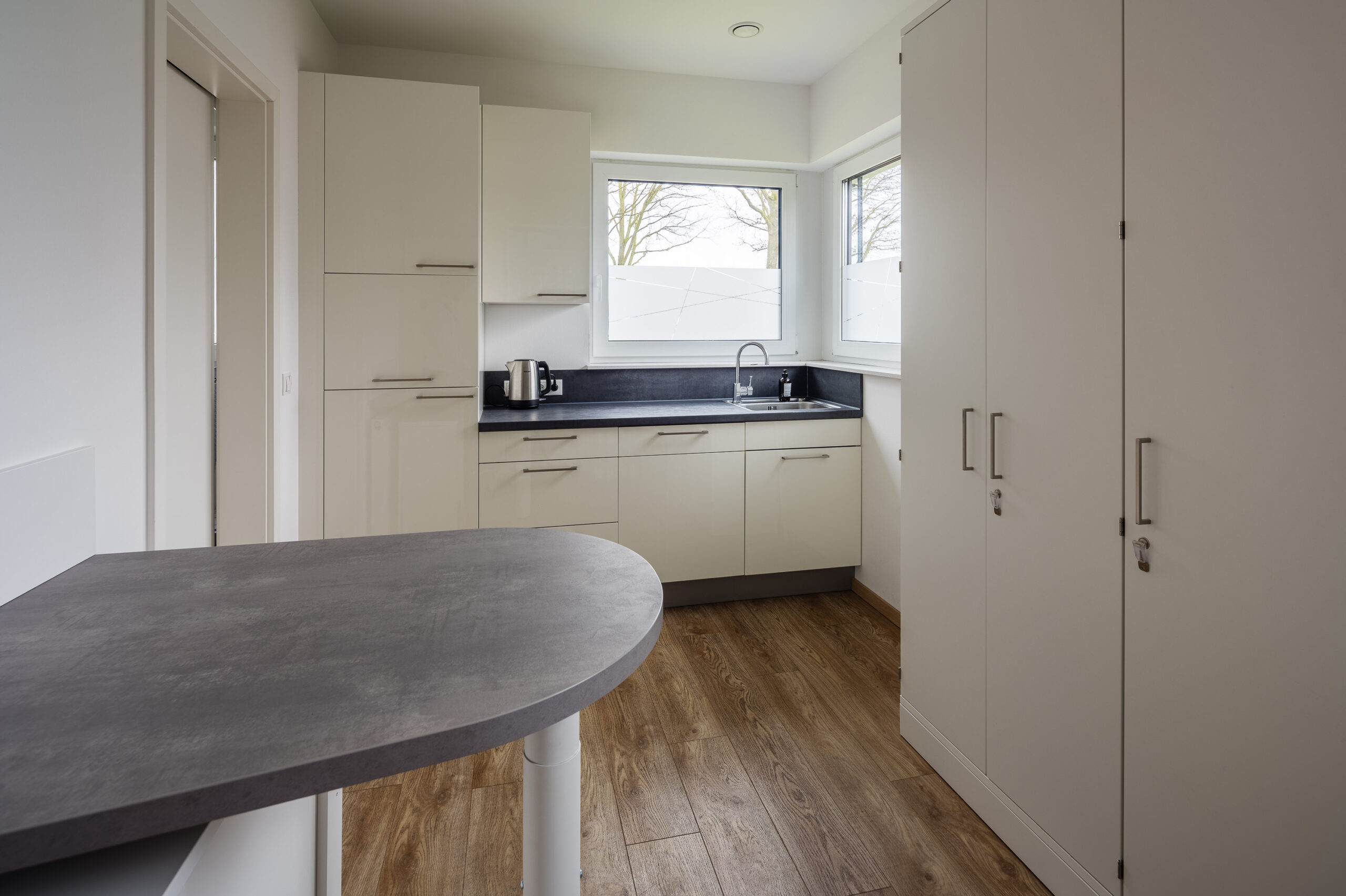 Durchdachte Details wie ein fugenloses Waschbecken, integrierte Spender für Hygienetücher sowie sensorgesteuerte, kontaktlose Öffnungssysteme bei Aufziehschränken unterstützen effiziente und hygienische Abläufe. Eine versteckte Nische für technische Geräte wie Drucker sorgt für ein aufgeräumtes Erscheinungsbild, während speziell angepasste Schränke ausreichend Platz für medizinische Geräte bieten und diese optimal integrieren. Ein ganz besonderes Highlight ist für das Praxisteam die maßgefertigte Empfangstheke aus der Manufaktur.